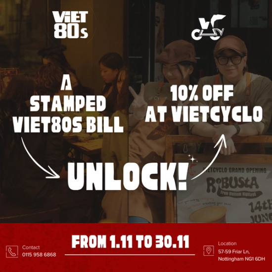 This November: Every Viet80s Bill Unlocks 10% Off at VietCycloNov 01, 2025We're excited to announce an exclusive cross-promotional partnership that brings exceptional value to our Viet80s family throughout November 2025. Starting November 1st, every customer who dines at Viet80s will automatically receive a 10% discount voucher for VietCyclo – Nottingham's premier Vietnamese café – printed directly on their bill with our official embossed stamp. EXPERIENCE DOUBLE THE VIETNAMESE CULTURE THIS NOVEMBERThis isn't a sweepstakes or a limited giveaway. This is an automatic benefit for every single Viet80s customer, every single time you visit us during November. Our goal is simple: to thank our loyal patrons while introducing you to another outstanding Vietnamese Cafe experience right here in Nottingham. HOW THE VIET80S × VIETCYCLO PROMOTION WORKSGetting your 10% VietCyclo discount couldn't be easier. Here's the complete step-by-step process: STEP 1: DINE AT VIET80SVisit Viet80s anytime during November 2025. Whether you're enjoying lunch, dinner, or takeaway, every service qualifies for the promotion. STEP 2: RECEIVE YOUR VOUCHERWhen you receive your bill, you'll notice the VietCyclo promotion printed directly on it, complete with our embossed Viet80s logo stamp. This stamped bill IS your voucher – no additional cards, apps, or sign-ups required. Our staff will also verbally introduce the offer to ensure you don't miss this opportunity. STEP 3: VISIT VIETCYCLO WITHIN 7 DAYSYour voucher is valid for 7 days from the date on your Viet80s bill. This gives you the perfect window to plan your VietCyclo visit while maintaining the freshness and urgency of the promotion. STEP 4: ENJOY 10% OFF EVERYTHINGPresent your stamped Viet80s bill at VietCyclo and receive 10% off your entire purchase. The discount applies to all food and beverages – from their famous Vietnamese coffee and specialty espresso drinks to bánh mì, pastries, rice bowls, and light meals. WHY YOU'LL LOVE THIS PARTNERSHIPDISCOVER AUTHENTIC VIETNAMESE COFFEE CULTUREWhile Viet80s brings you the hearty, comforting flavors of Vietnamese cuisine, VietCyclo specializes in Vietnam's vibrant café culture. This promotion creates the perfect excuse to experience both sides of Vietnamese culinary tradition. AUTOMATIC SAVINGSNo apps to download, no loyalty cards to remember, no hoops to jump through. Simply dine at Viet80s and receive immediate value. FLEXIBLE REDEMPTIONWith a 7-day validity window, you can plan your VietCyclo visit around your schedule. Morning coffee run? Afternoon study session? Weekend brunch? Your voucher works anytime within the week. SUPPORT LOCAL VIETNAMESE BUSINESSESThis partnership strengthens Nottingham's Vietnamese food community and creates connections between two businesses committed to authentic, quality experiences. UNLIMITED REDEMPTIONSVisit Viet80s multiple times in November? Each visit generates a new voucher! There's no limit to how many times you can take advantage of this offer throughout the month. TERMS & CONDITIONS• Promotion valid November 1-30, 2025 • All Viet80s customers qualify (dine-in services) • Voucher = Viet80s bill with embossed logo stamp • Voucher valid for 7 days from bill date printed on receipt • 10% discount applies to entire bill at VietCyclo • Discount applies to all food and beverage items at VietCyclo • One voucher per transaction at VietCyclo • Original stamped bill must be presented (photo copies not accepted) • Cannot be combined with other VietCyclo promotions or discounts • No cash value; discount only REQUENTLY ASKED QUESTIONSQ: Can I use my Viet80s voucher multiple times? A: Each Viet80s bill serves as one voucher for one VietCyclo transaction. However, you can visit Viet80s multiple times throughout November and receive a new voucher with each visit! Q: Does this work for takeaway orders at Viet80s? A: Absolutely! Any service at Viet80s qualifies – dine-in, takeaway, lunch, dinner. Every bill comes with the promotion. P/s: It does not work with Delivery from Deliveroo or UberEATS Q: What if I lose my stamped bill? A: Unfortunately, the original stamped bill is required for redemption. We recommend taking a photo for reference, but you'll need to present the physical stamped receipt at VietCyclo. Q: Can I combine this with other discounts at VietCyclo? A: This promotion can be combined with VietCyclo loyalty membership or promotions. However, 10% off everything is already an exceptional value! Q: Does the 7-day validity start from the day I visited Viet80s? A: Yes, the 7-day countdown begins from the date printed on your Viet80s bill. Plan accordingly to maximize your voucher! Q: What items at VietCyclo are included in the discount? A: Everything! The 10% discount applies to all food and beverage items on VietCyclo's menu. Q: Can I visit VietCyclo first and then Viet80s? A: The promotion flows from Viet80s to VietCyclo. You must dine at Viet80s first to receive the voucher, then redeem it at VietCyclo within 7 day |