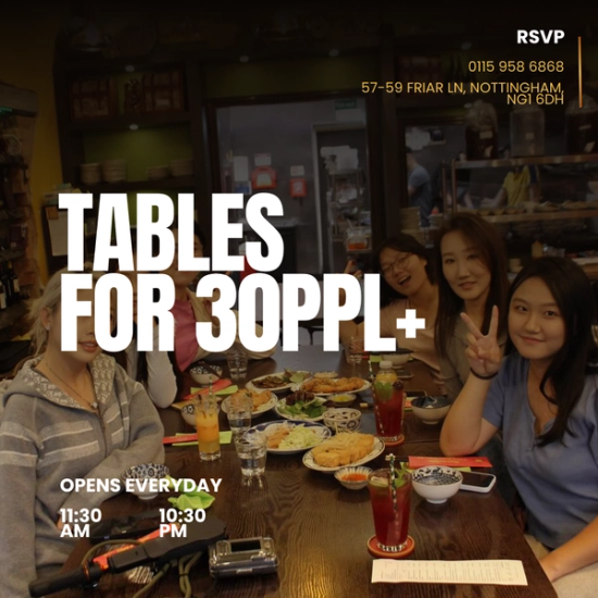 - 20-30 guests - Call ahead 1-2 hours if possible (+44 115 958 6868), we'll prep tables - 30+ guests - Booking required (guarantees seating + faster service with pre-orders) Peak times (Fri-Sat 6pm-9pm, Sun 12pm-3pm): Large groups should book in advance. Perfect Menus for Large Groups Option 1: Family-Style Feast (Most Popular) Best for groups who want to share and try everything. Starter Platters (serves 30): - 60x Fresh Spring Rolls (Goi Cuon) - 30x Fried Spring Rolls (Cha Gio) Main Course Platters: - 15x Beef Pho (Various options) from £13.50/ea - 10x Bun Cha nem thit nuong (Charcoal Grilled Pork & Noodles) from £13.50/ea - 5x Stir fried Rice - 10x Com Ga Nuong (Claypot rice with Chicken) Drinks: - 30x Vietnamese Iced Coffee - 15x Fresh Soul Hanoi Total: ~£900 for 30 guests (£30/person for generous portions) Option 2: Set Menu per Person Set Menu A (£25-£30/person): - Fresh Spring Rolls (starter) - Choice of: Beef Noodles or Stir fried Rice - Vietnamese Coffee OR Vietnamese Fruit drinks Set Menu B (£32-£40/person): - 2 starters of choice - Choice of: Any 2 main courses from full menu - Dessert (Che Ba Mau - Vietnamese Sweet Soup) - Vietnamese Coffee OR any soft drinks Minimum 20 guests for set menus. We'll help you calculate portions. Just tell us: - Group size - Appetites (light/moderate/hungry) - Dietary needs (vegetarian, halal, allergies) - Budget per person What You Get with Viet80s Large Group Bookings - Dedicated service team for your group (1 server per 10-12 guests) - Table setup in advance (decorated if you want - bring banners/balloons, we'll arrange) - Flexible payment (split bills, single bill, pre-paid options available) - Dietary accommodations (vegetarian, vegan, halal, gluten-free - just tell us in advance) - Extended seating time (we won't rush you - book 2-3 hours for dining + socialising) - BYO cake allowed (no cakeage fee for birthday/celebration cakes) How to Book Your Large Group Step 1: Contact Us Phone: +44 (0)115 958 6868 Email: info@viet80s.co.uk Tell us: - Date & time - Number of guests - Occasion (birthday, work dinner, family reunion, etc.) - Menu preferences (family-style, set menu, or full menu choice) Step 2: We'll Confirm - Table configuration - Menu options + pricing - Deposit (£5-10/person for groups 30+, refundable if cancelled 48hrs+ in advance) Step 3: Pre-Order (Optional but Recommended)